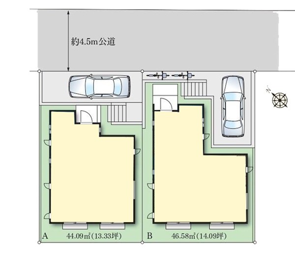 | 駐車場 | 1台 | 道路の幅員 | A号棟:北東4.5m /B号棟:北東4.5m |