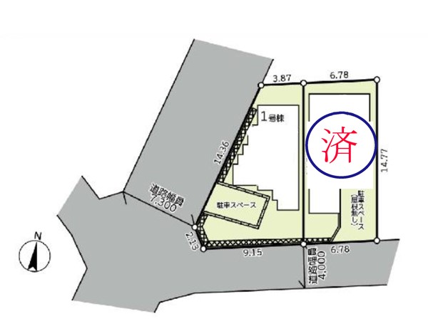 | 駐車場 | 1台 | 道路の幅員 | 1号棟:西7m 南4m |