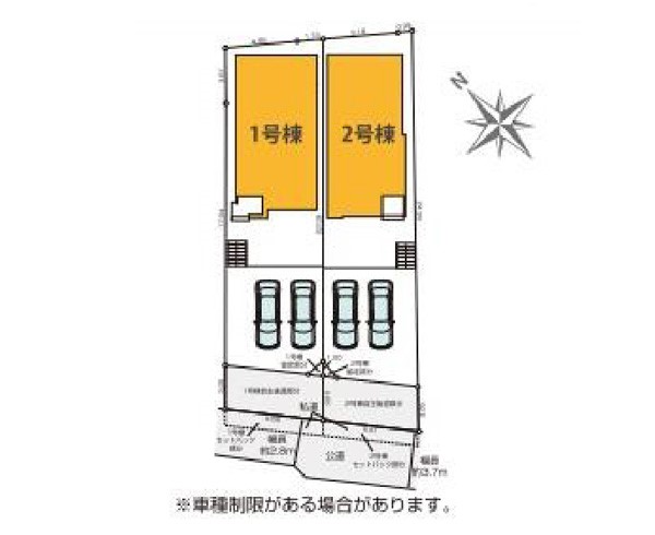 | 駐車場 | 2台 | 道路の幅員 | 1号棟:南西2.8m /2号棟:南西3.7m |