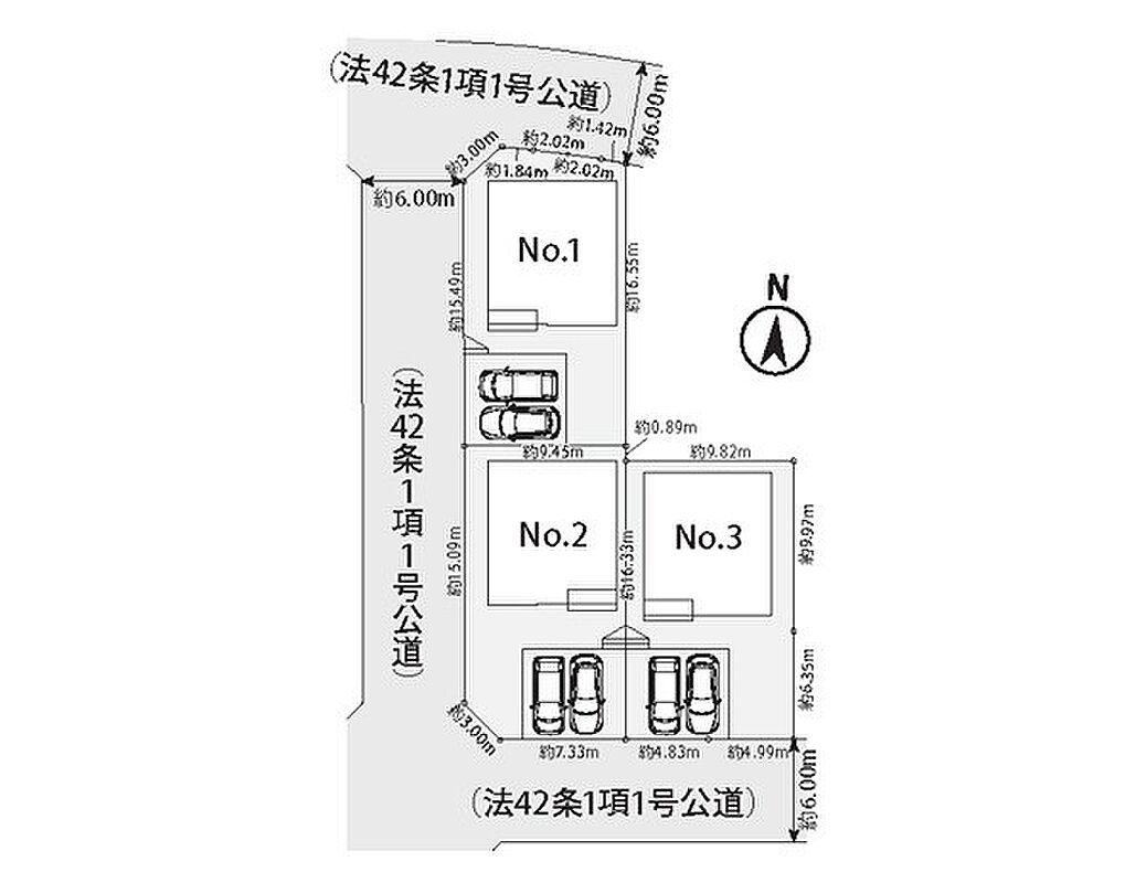| 駐車場 | 2台 | 道路の幅員 | 1号棟:西6m 北6m /2号棟:西6m 南6m /3号棟:南6m |