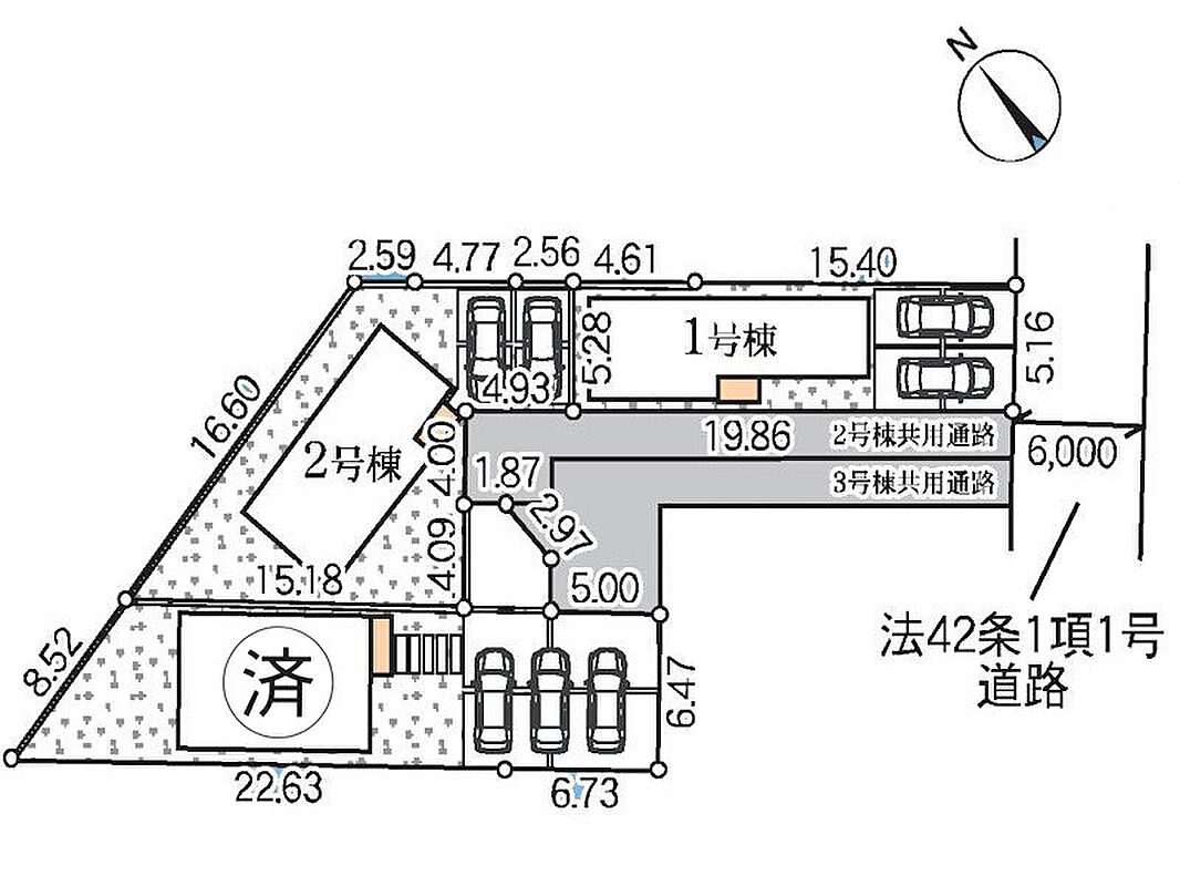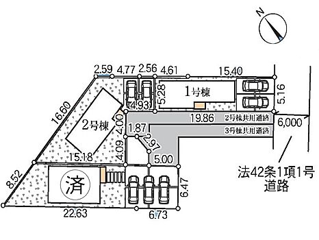 | 駐車場 | 2台 | 道路の幅員 | 1号棟:南東6m /2号棟:南東6m |