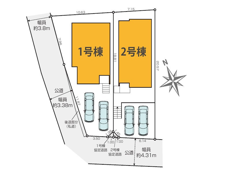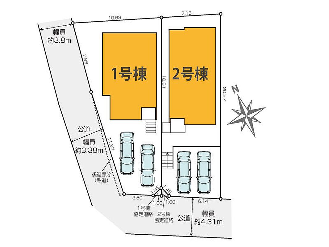 | 駐車場 | 2台 | 道路の幅員 | 2号棟:南西4.3m /1号棟:南西4.3m 北西3.3m |