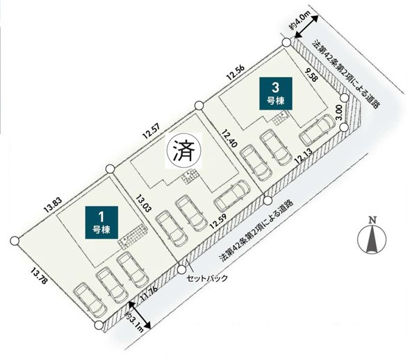 | 駐車場 | 3台 | 道路の幅員 | 1号棟:南東3.1m /3号棟:南東3.1m 北東4m |