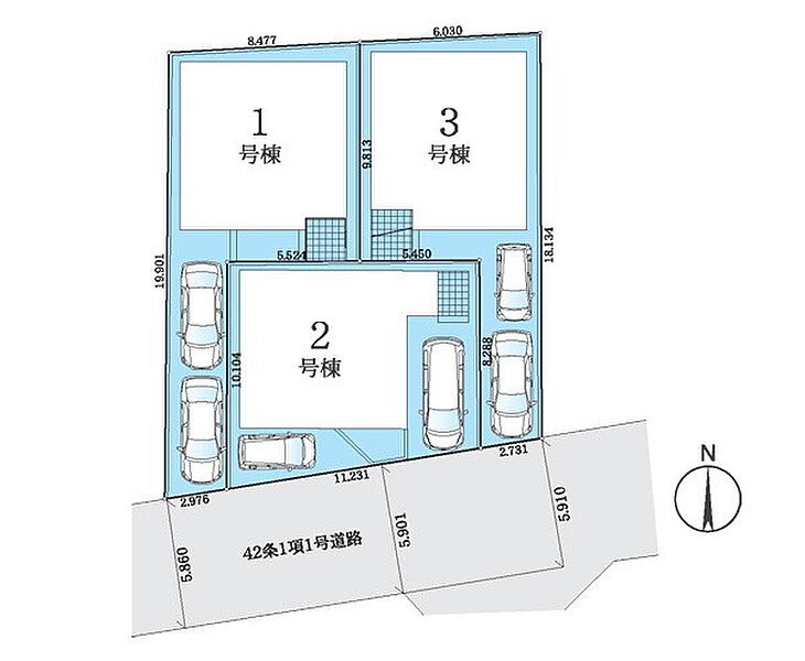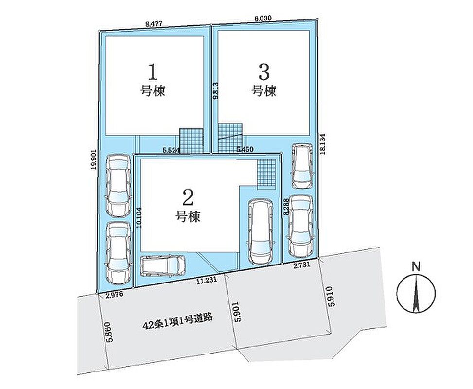 | 駐車場 | 2台 | 道路の幅員 | 1号棟:南5.9m /3号棟:南5.9m /2号棟:南5.9m |