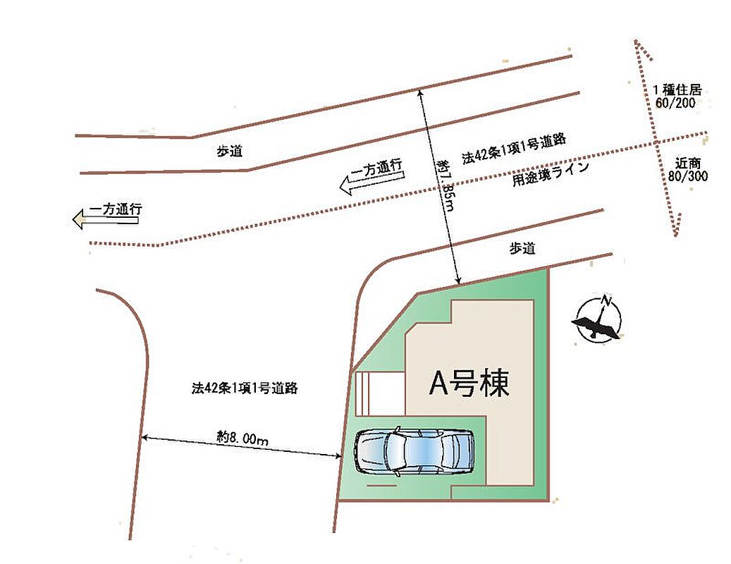 | 駐車場 | 1台 | 道路の幅員 | A号棟:北7.8m 西8m |