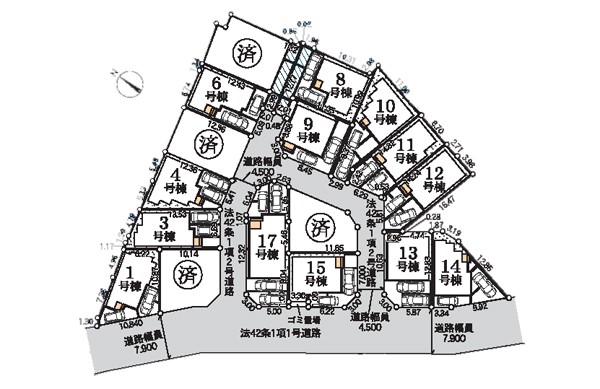 | 駐車場 | 2台 | 道路の幅員 | 14号棟:南西7.9m /1号棟:南西7.9m /3号棟:南東4.5m /9号棟:西4.5m /17号棟:南西7.9m 北東4.5m 北西4.5m /10号棟:西4.5m …他 |