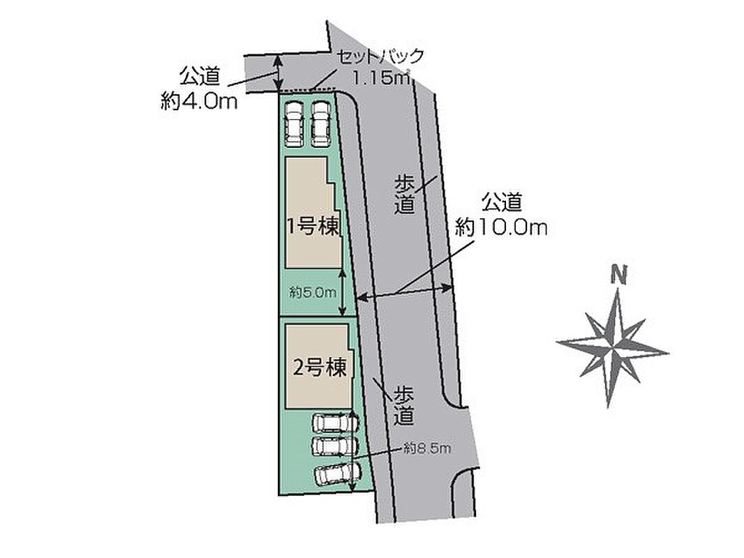 | 駐車場 | 2台 | 道路の幅員 | 1号棟:東10m 北4m /2号棟:東10m |