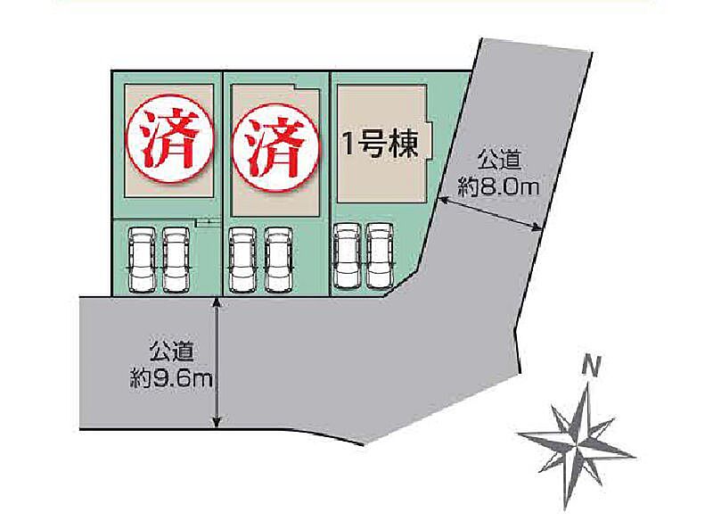 | 駐車場 | 2台 | 道路の幅員 | 1号棟:東8m 南9.6m |