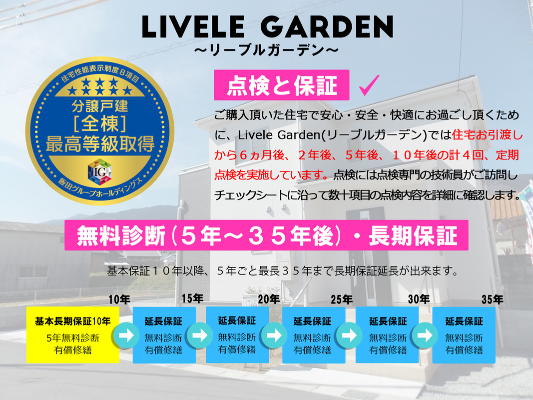 ご購入頂いた住宅で安心・安全・快適にお過ごし頂くために、Livele Gardenでは住宅お引渡しから6ヶ月後、2年後、5年後、10年後の計4回、定期点検を実施しています。点検には専門スタッフがチェックシートに沿って数十項目の点検内容を詳細に確認します。