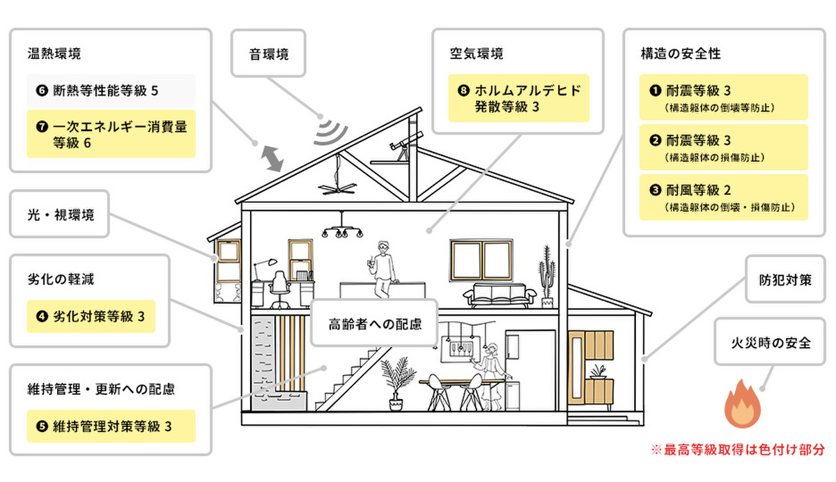 国土交通省が指定した第三者機関が、住宅の安心・安全の度合いを客観的に評価する住宅性能表示制度。専門知識のない方にも建物の性能がわかる「住宅の鑑定書」のようなもの。Livele Garden(リーブルガーデン)は住宅性能評価の4分野6項目において最高等級取得を標準化しています。