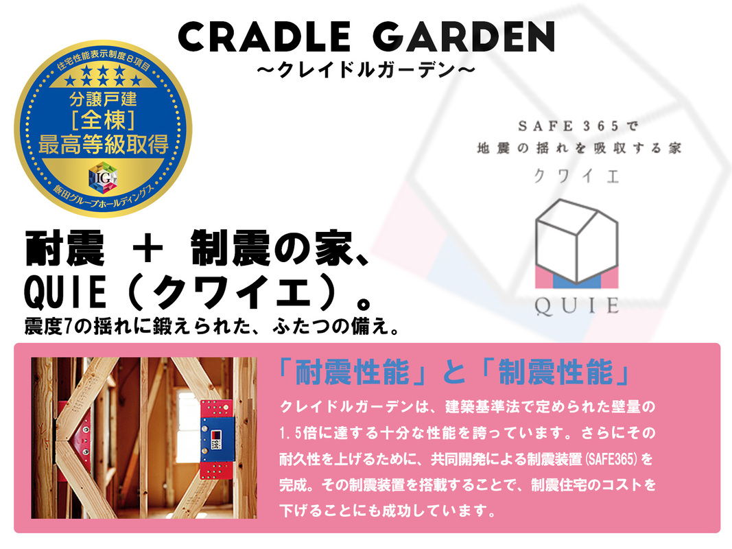 Cradle Garden(クレイドルガーデン)は、建築基準法で定められた壁量の1.5倍に達する十分な性能を誇っています。さらにその耐久性を上げるために、共同開発による制震装置(SAFE365)を完成。地震の揺れに耐える「耐震性能」と、揺れを抑えて住宅へのダメージを軽減する「制震性能」を兼ね備えた建売住宅ブランド「QUIE」。ふたつの備えで、お家を守ります。
