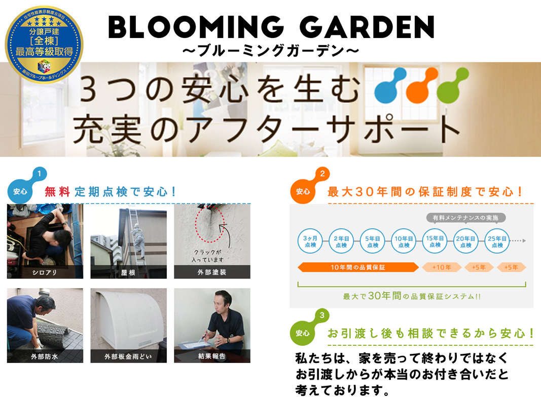 住宅性能評価書とは、いわば住宅の性能を表した成績表です。Blooming Gardenでは「設計」と「建設」の「住宅性能評価書」を全棟ダブル取得!設計性能評価と、現場での厳しい社内チェックに加え、国が認めた第三者機関の評価員が4回の検査を1棟1棟厳密にチェック。4回の現場検査をクリアした建設性能評価を取得しているからこそ、安心へのこだわりが違います!