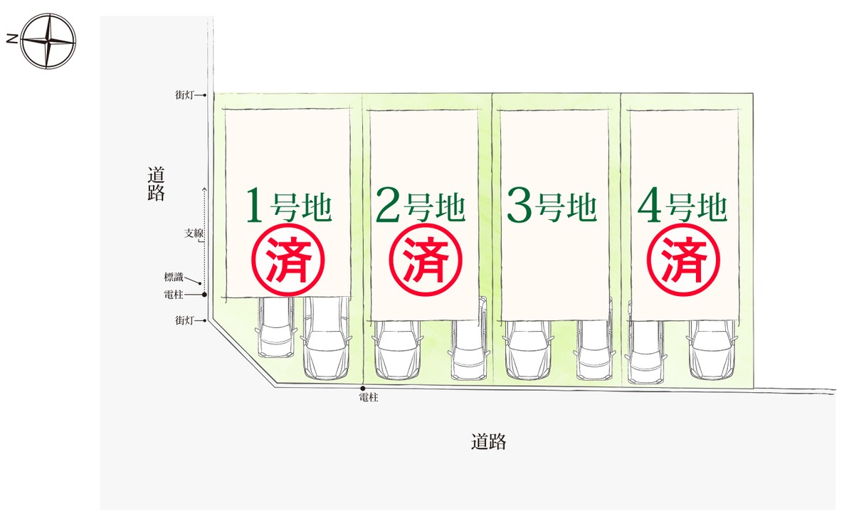 | 駐車場 | 2台 | 道路の幅員 | 北側公道約7.268m~7.281m、西側公道約7.25m~7.261m |