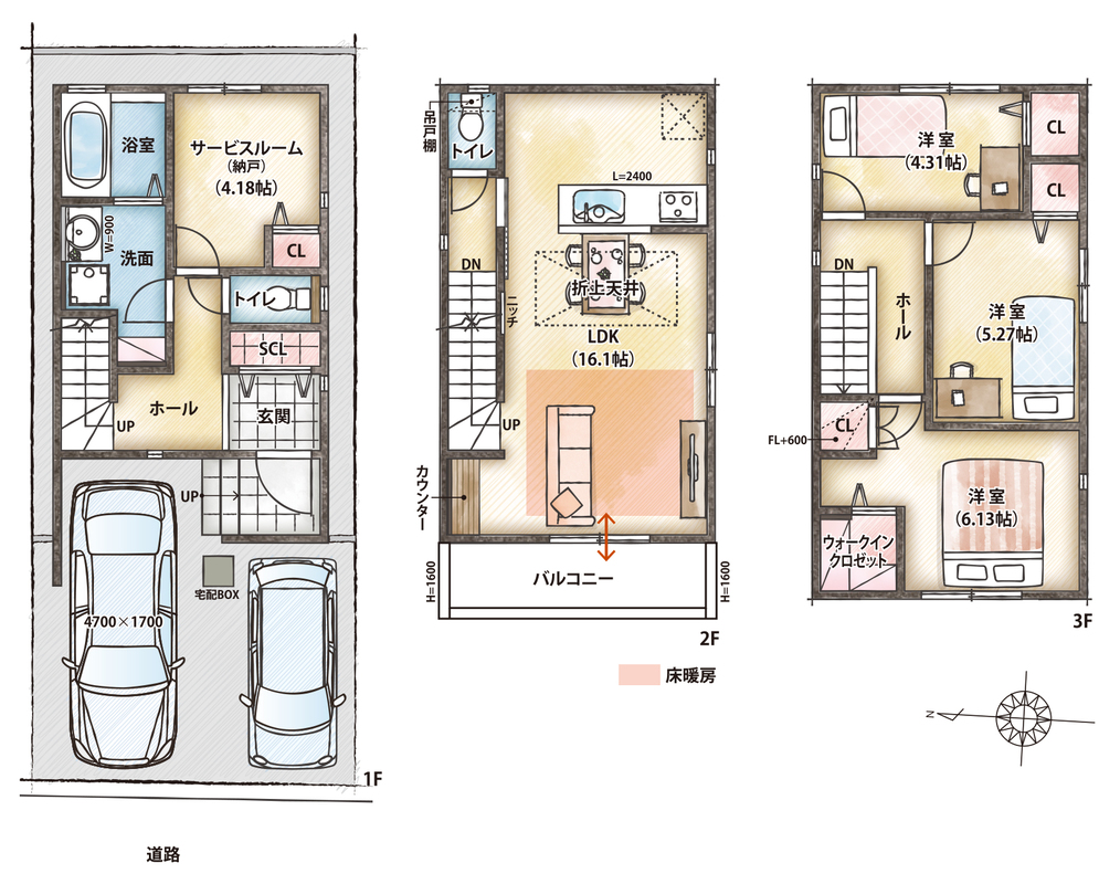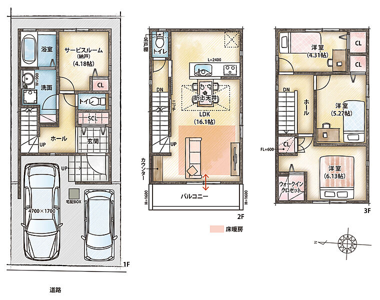 ■全邸に2台駐車スペースを確保(※車種による)。お車をお持ちの方にもうれしいプランです。