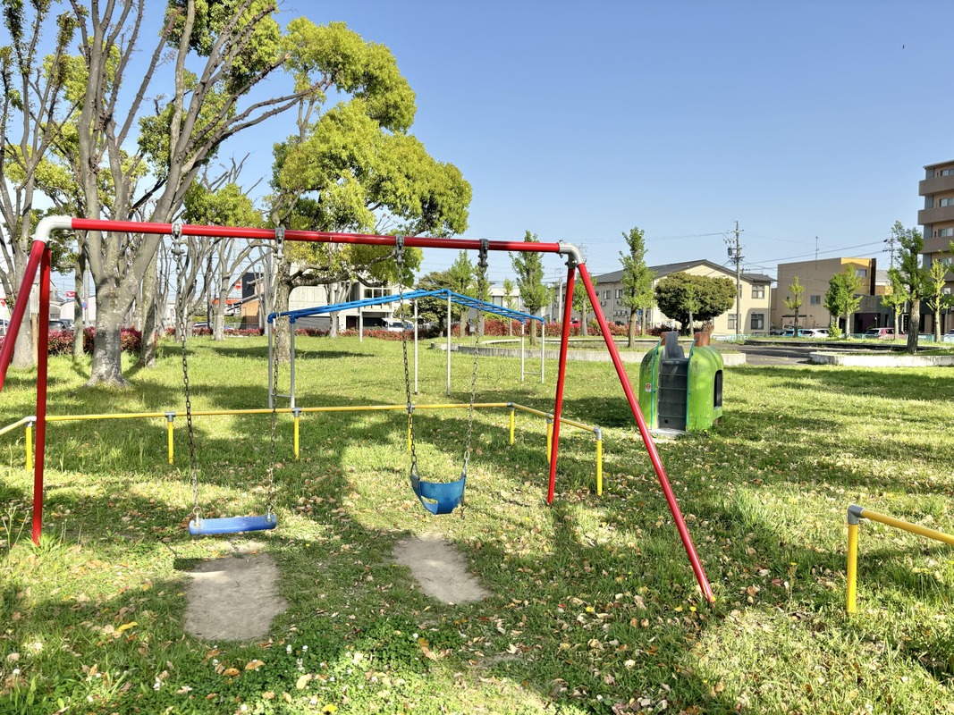 滑り台・ブランコ・うんていなどの遊具が設置された公園。芝生のス...