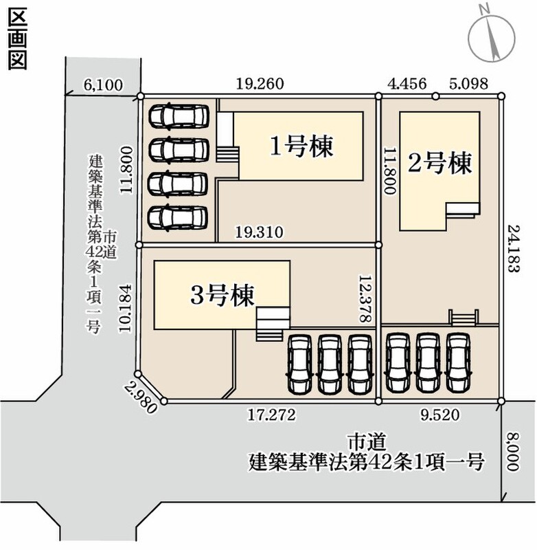 | 駐車場 | 3台 ~ 4台(車種による) | 道路の幅員 | 南側8m公道、西側6m公道 |