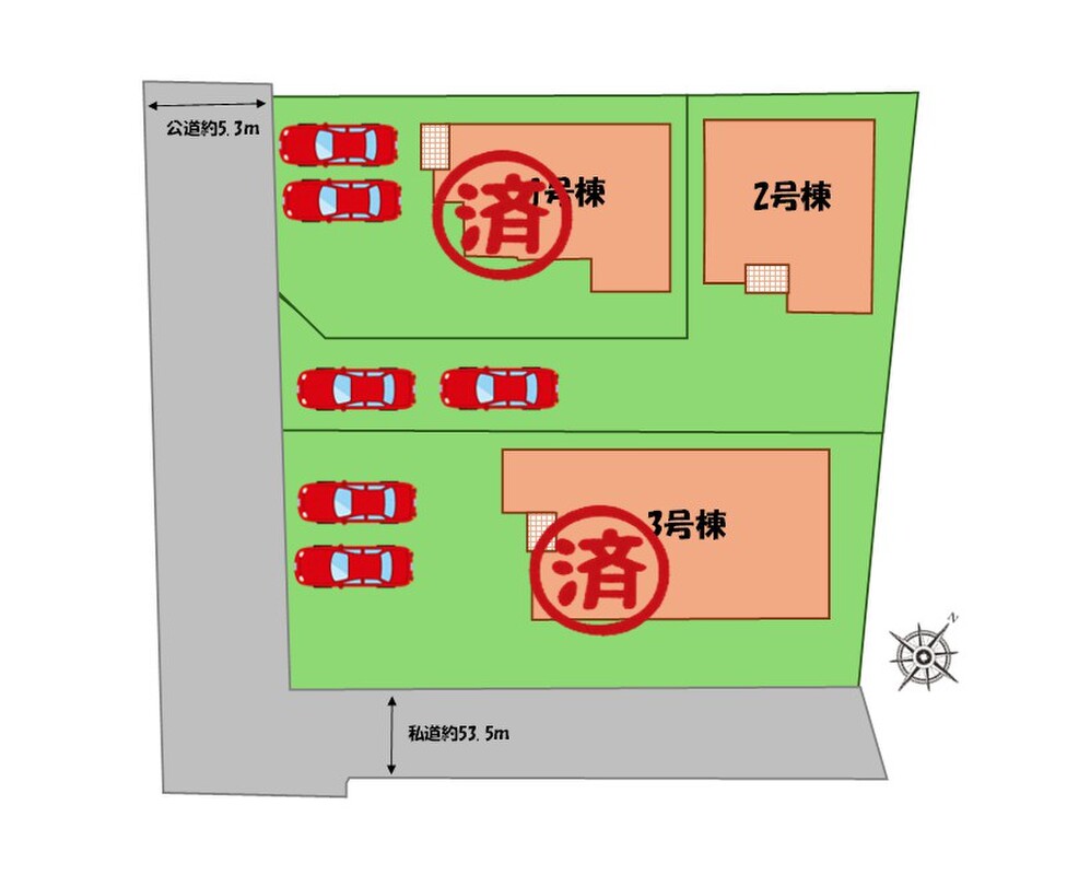 | 駐車場 | 2台(車種による) | 道路の幅員 | 道路幅:3.5m~5.3m、アスファルト舗装、南西側、公道・南東側、私道 |