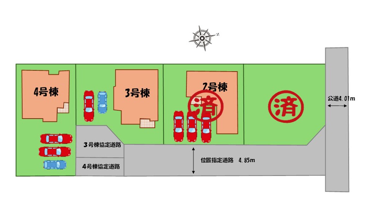 | 駐車場 | 2台 ~ 3台(4号棟(3台)、3号棟(2台)) | 道路の幅員 | 道路幅:4.8m、アスファルト舗装、北側、位置指定道路 |