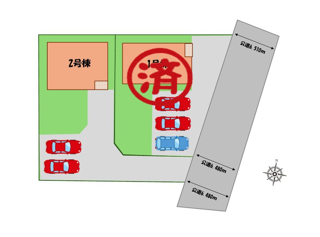 | 駐車場 | 2台 ~ 3台(車種による) | 道路の幅員 | 道路幅:6.4m~6.5m、アスファルト舗装 |