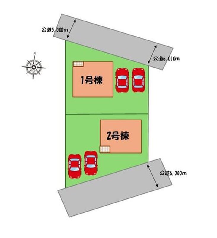 | 駐車場 | 2台(車種による) | 道路の幅員 | 道路幅:5m~6m、アスファルト舗装、北側、南側、公道 |