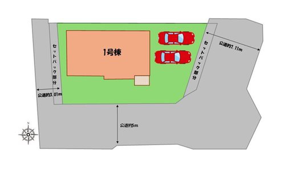 | 駐車場 | 2台 | 道路の幅員 | 道路幅:3m~7.1m、アスファルト舗装、西側、南側、東側、公道 |
