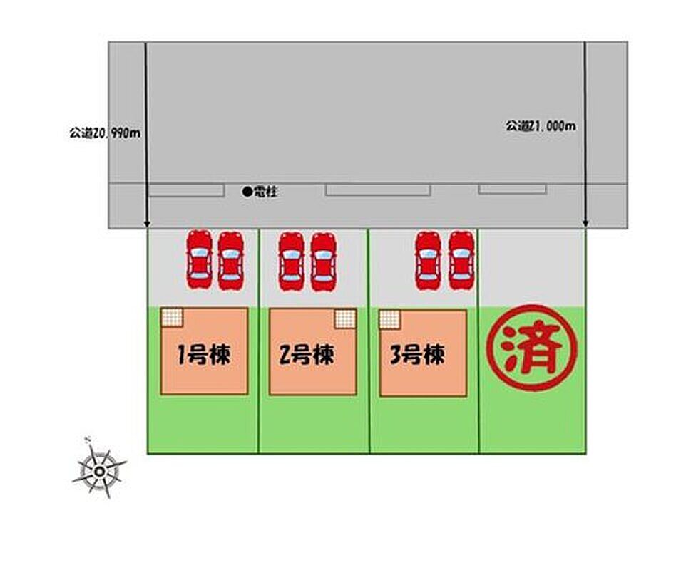 | 駐車場 | 2台(車種による) | 道路の幅員 | 道路幅:20.9m~21m、アスファルト舗装、北側、公道 |