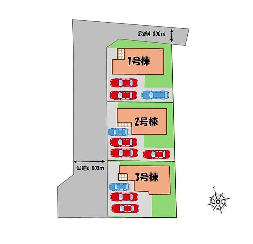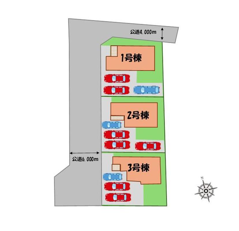 | 駐車場 | 3台 ~ 4台(1・3号棟(3台)、2号棟(4台)※車種による) | 道路の幅員 | 道路幅:4m~6m、アスファルト舗装、北側、西側、公道 |