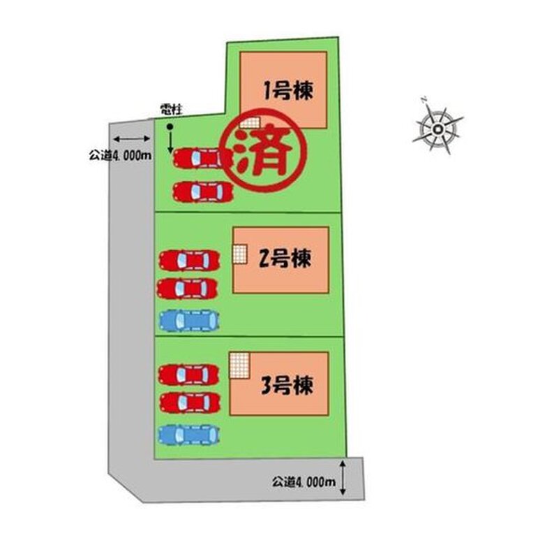 | 駐車場 | 2台 ~ 3台(車種による) | 道路の幅員 | 道路幅:4m、アスファルト舗装、西側、南側、公道 |