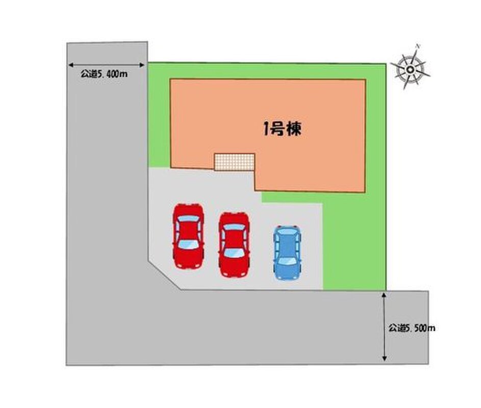 | 駐車場 | 3台(車種による) | 道路の幅員 | 道路幅:5.4m~5.5m、アスファルト舗装、南側、西側、公道 |