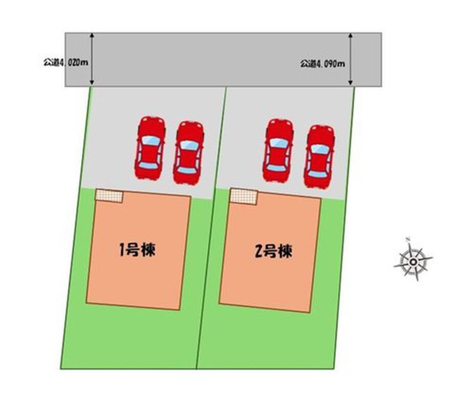 | 駐車場 | 2台(車種による) | 道路の幅員 | 道路幅:4m、アスファルト舗装、北側、公道 |