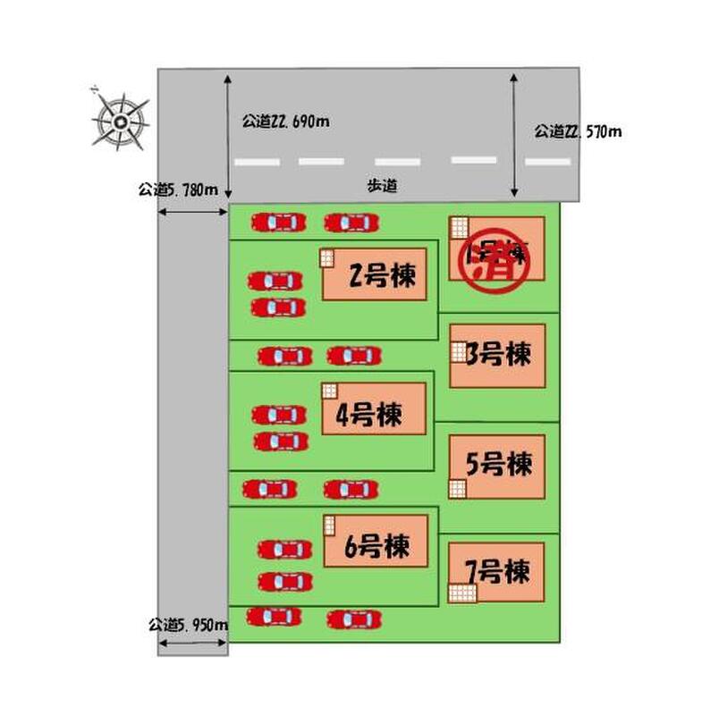 | 駐車場 | 2台(車種による) | 道路の幅員 | 道路幅:5.7m~22.5m、アスファルト舗装、北側、西側、公道 |