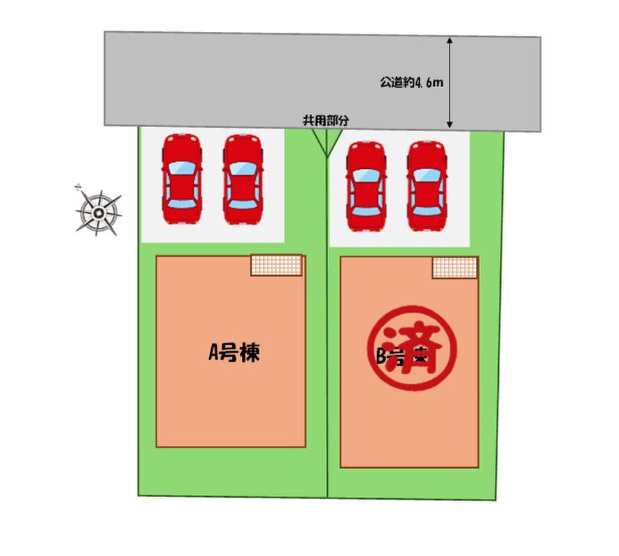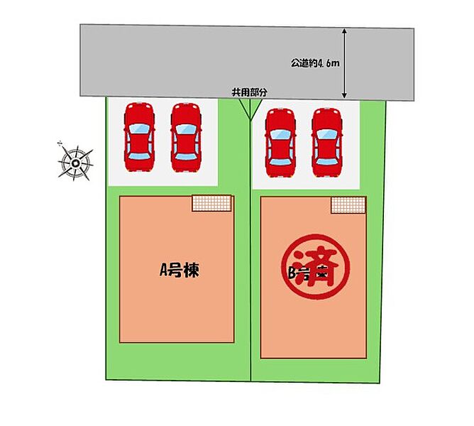| 駐車場 | 2台(車種による) | 道路の幅員 | 道路幅:4.6m、アスファルト舗装、北側、公道 |