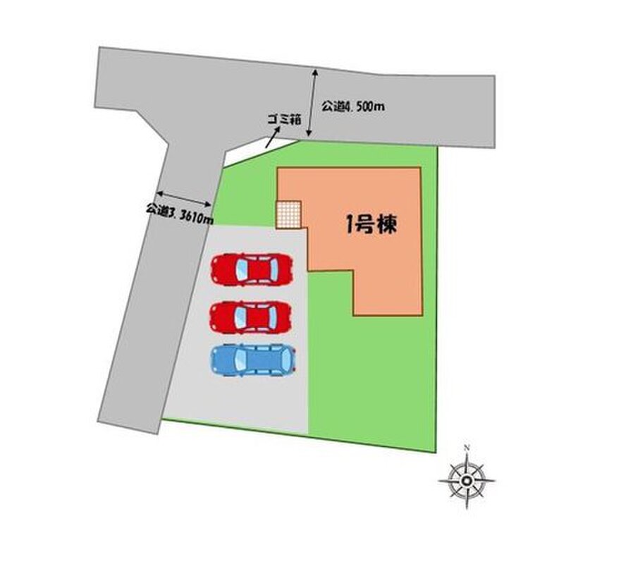 | 駐車場 | 3台(車種による) | 道路の幅員 | 道路幅:3.3m~4.5m、アスファルト舗装、西側、北側、公道 |