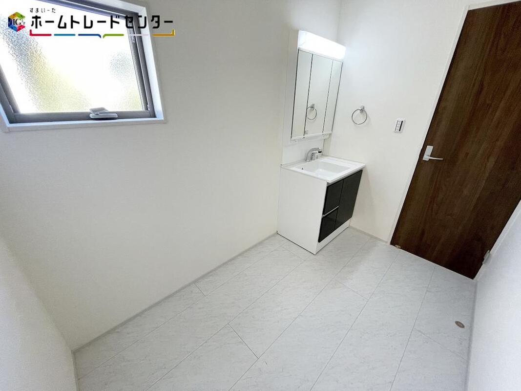 白を基調とした爽やかなサニタリースペース。清潔感のある快適空間です。毎日の身支度も気持ち良くお使い頂けます!洗面台は三面鏡となっております!