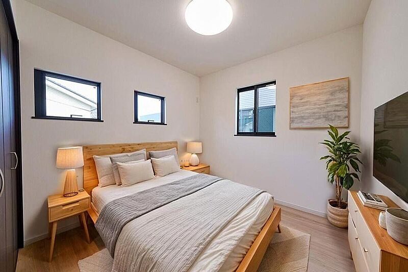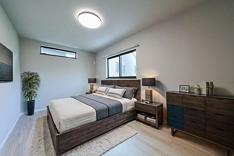 【施工例】寝室には大容量のウォークインクローゼット完備!豊富な収納スペースで、衣類や個人のアイテムを整理整頓することができます。スッキリした寝室は癒しの空間を提供します。※家具等の配置はイメージです。