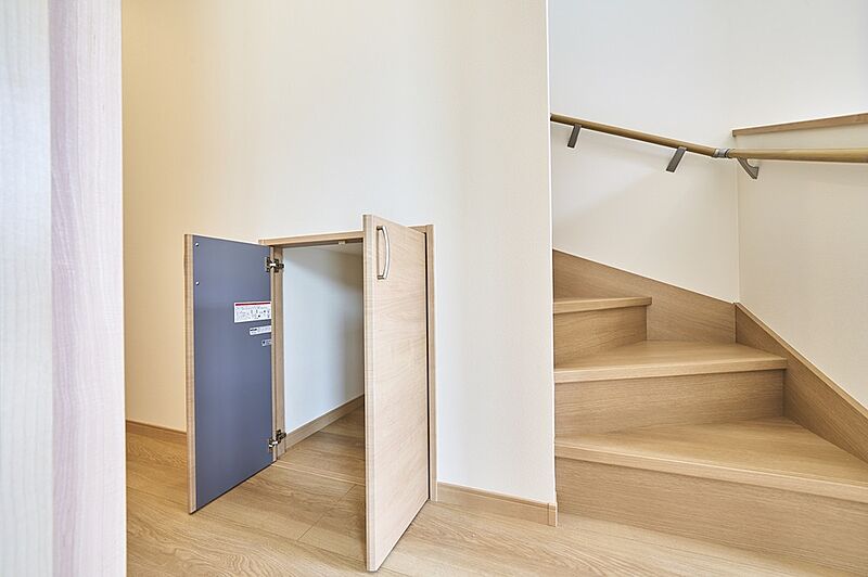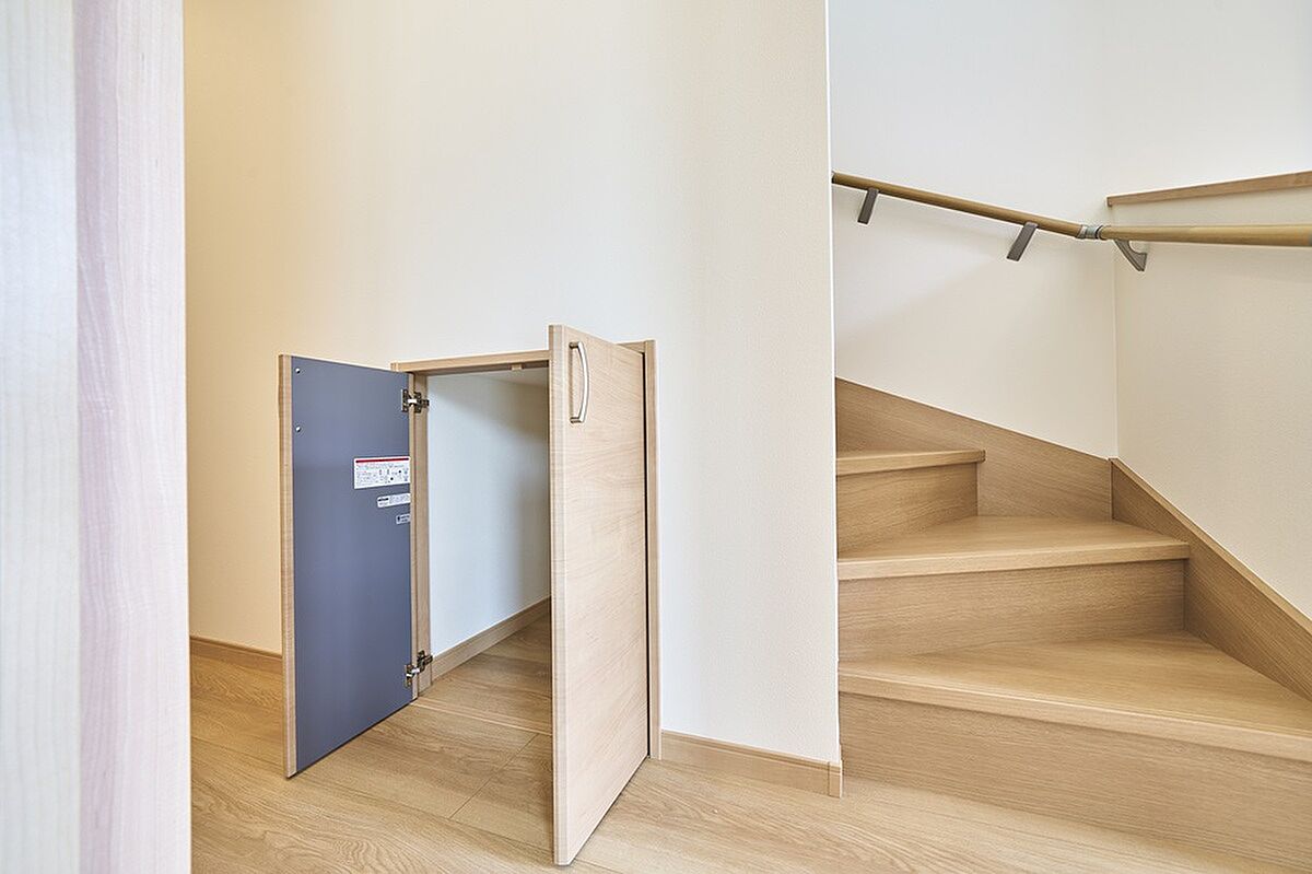 【施工例】階段下を活かした収納スペースは、日用品のストック置き場にぴったり。扉付きで生活感を隠せるのがポイント◎使いたいときにサッと取り出せる、便利な位置の収納です!