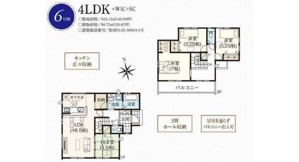 6号棟 間取り 4LDK 価格 3099万円 建物面積 98.75m2 土地面積 165.15m2 -