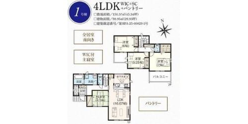 1号棟 間取り 4LDK 価格 3299万円 建物面積 98.95m2 土地面積 150.57m2 -