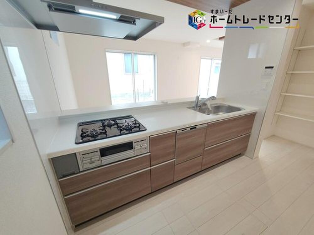 対面式キッチンは、いつでもご家族を感じられる空間作りの重要ポイントになりそうです。後片付けもラクラクなビルトイン食洗機付き。洗い終わった食器の水切りや乾燥としても便利です。