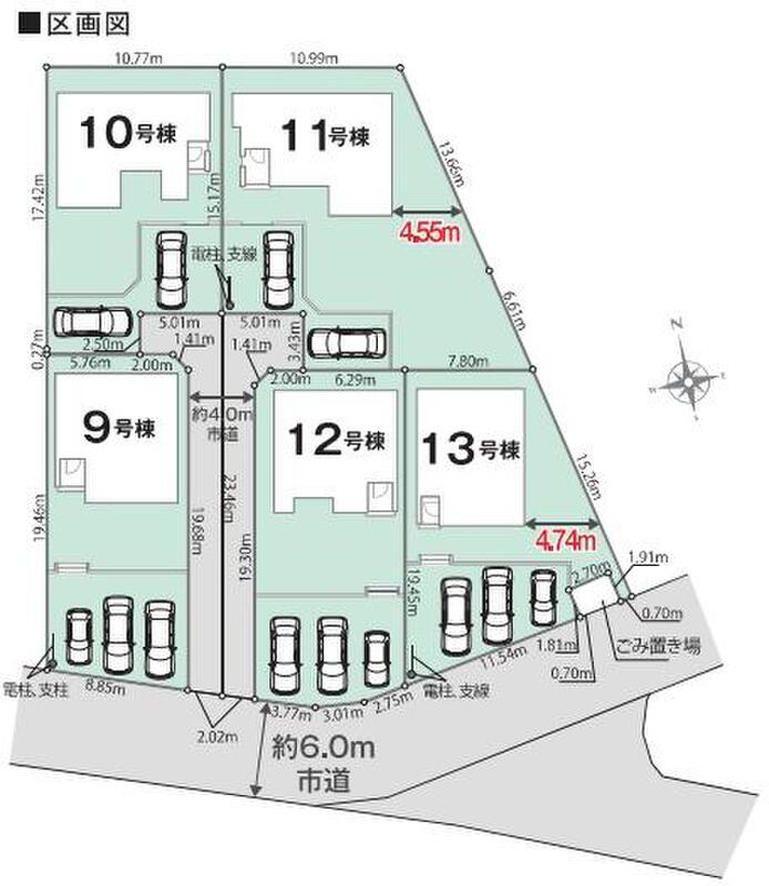 | 駐車場 | 2台 ~ 3台(10号棟(2台)、9・12・13号棟(3台)) | 道路の幅員 | 道路幅:4m・6m、アスファルト舗装、南側6m公道・区域内4m公道 |