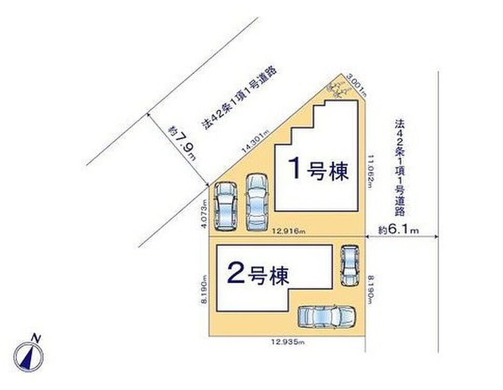 | 駐車場 | 2台 | 道路の幅員 | 道路幅:6.1m・7.9m、アスファルト舗装、北西側7.9m市道、東側6.1m市道 |