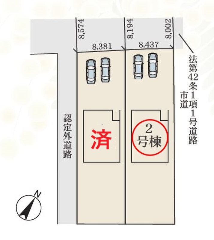 | 駐車場 | 1台 ~ 2台(2台分のカースペース) | 道路の幅員 | 南西側2.0m認定外道路、北西側8.0m公道 |