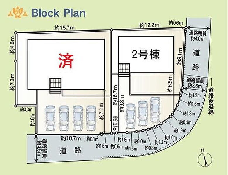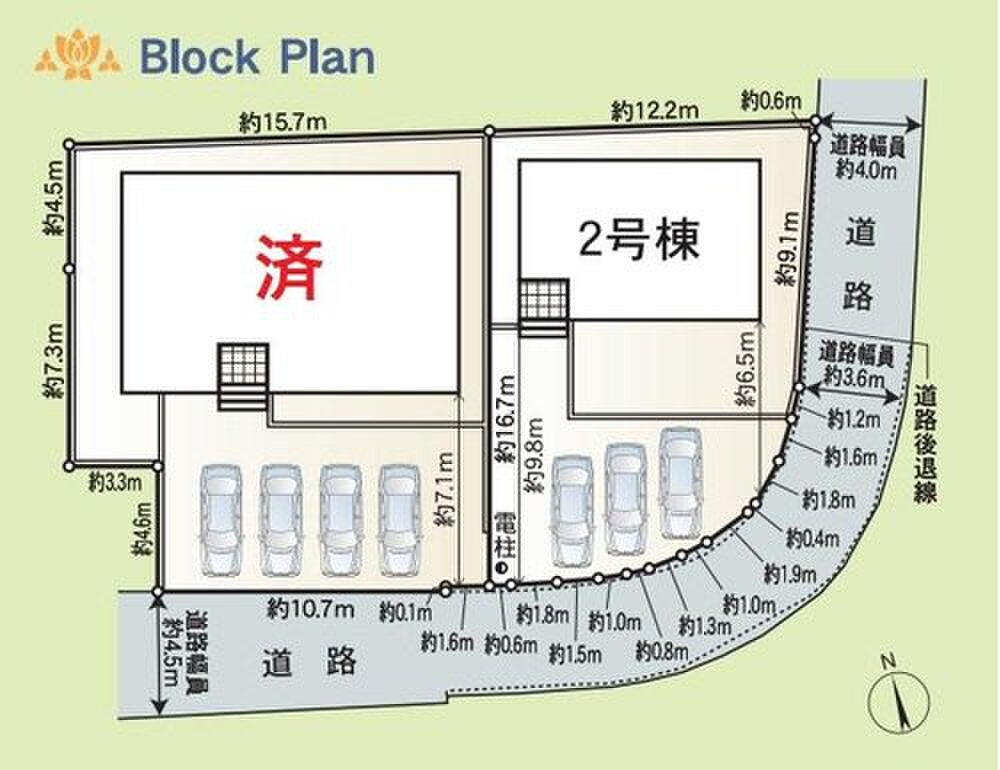 | 駐車場 | 3台 | 道路の幅員 | 道路幅:3.6m~4.5m、アスファルト舗装、南側4.57m、東側3.68m公道 |