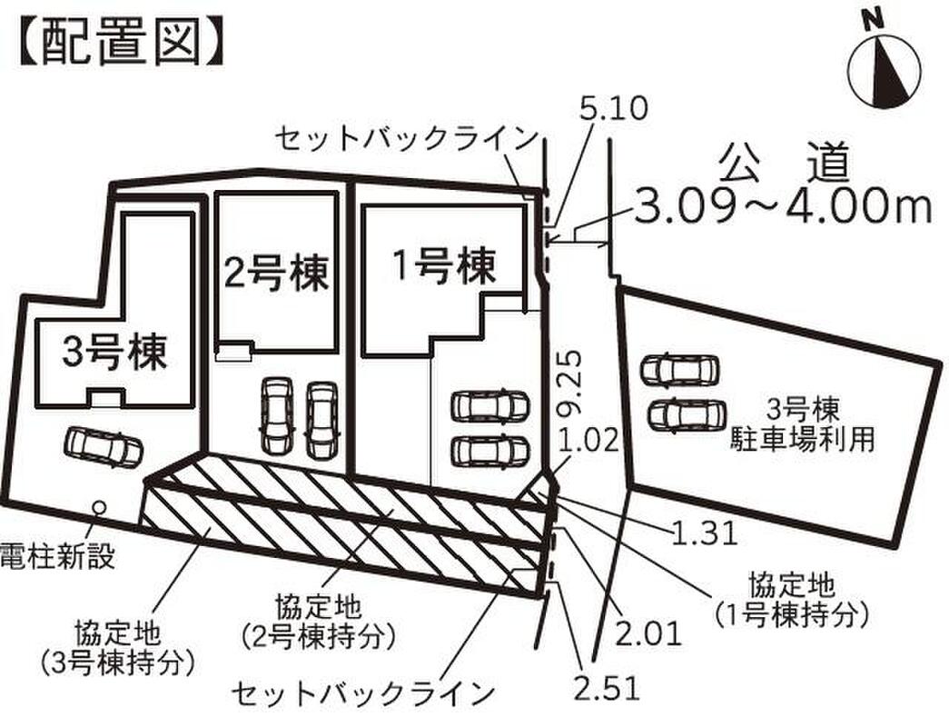 | 駐車場 | 2台 ~ 3台(1号棟(2台)・2号棟(2台)・3号棟(3台)) | 道路の幅員 | 道路幅:3m~4m、アスファルト舗装、東側3.0m~4.0m公道接道 |