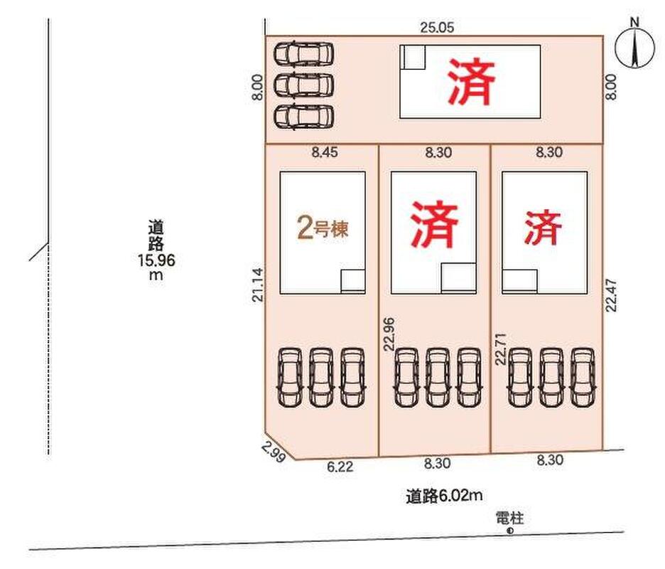 | 駐車場 | 3台(※車種による) | 道路の幅員 | 道路幅:6m~15.9m、アスファルト舗装、南側6.02m、西側15.96m公道 |