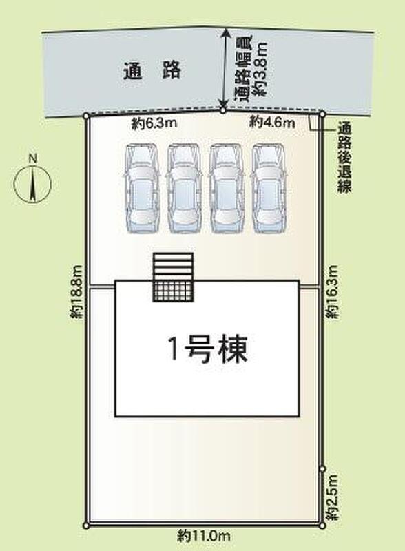 | 駐車場 | 4台(車種による) | 道路の幅員 | 道路幅:3.8m、アスファルト舗装、北側3.84m公道 |