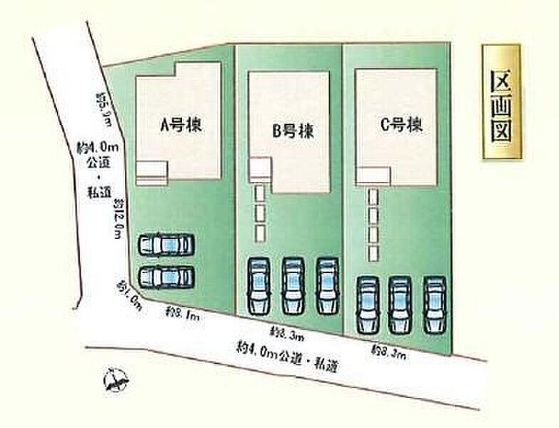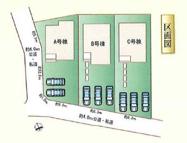 | 駐車場 | 2台 ~ 3台(A号棟(2台) B,C号棟(3台)) | 道路の幅員 | 道路幅:4m、アスファルト舗装、南側4.0m、西側4.0m公道 |