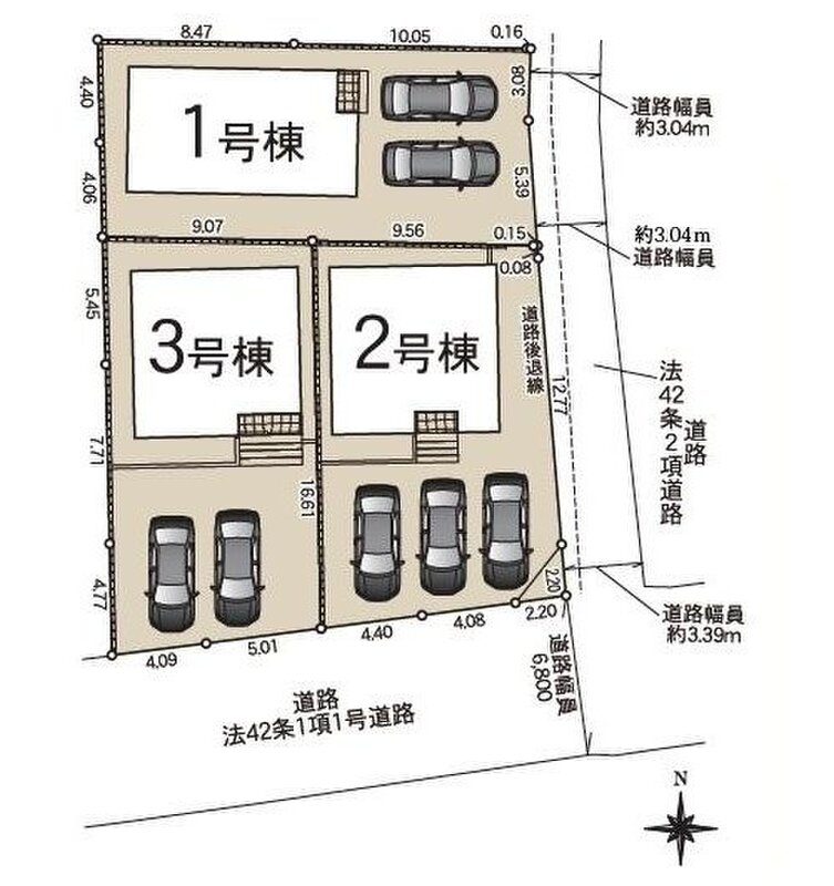 | 駐車場 | 2台 ~ 3台(2号棟のみ3台分) | 道路の幅員 | 道路幅:3m~6.8m、アスファルト舗装、東側3.0m南側6.8m公道接道 |