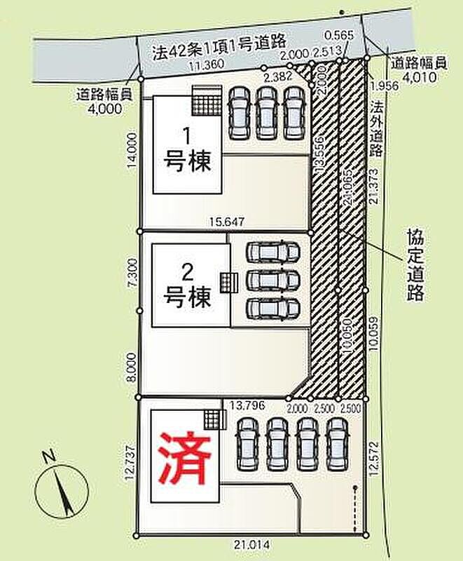 | 駐車場 | 3台 | 道路の幅員 | 道路幅:4m、アスファルト舗装、北側4.0m公道 |