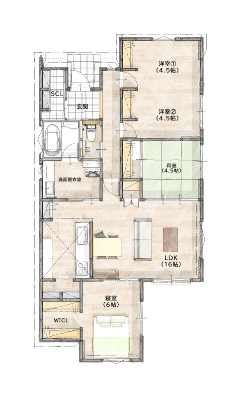 SCL・WICLに加えてパントリーを2ヶ所設けた充実の収納設計。日用品から食材までしっかり整理でき、家中がすっきりと片付きます。